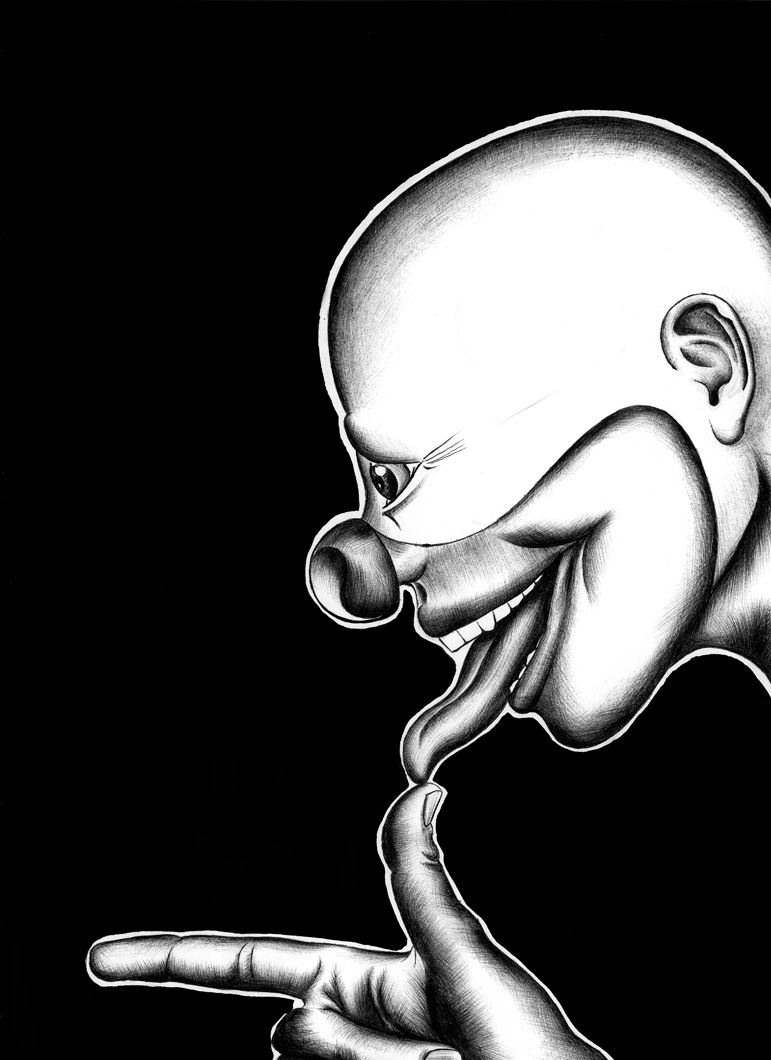 Clowns dérangeants, provocateurs. Illustration au stylo à bille, fond à l'encre de chine.